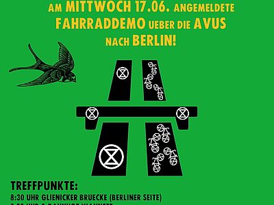Zu Hochzeiten der Corona-Krise haben wir gemerkt, wie wichtig das Fahrrad als krisensichere Mobilitätsform ist. Mit der Volksinitiative wollen wir die Politik zwingen, endlich für die nötige Radinfrastruktur in der Region zu sorgen. Am Mittwoch, den 17. Juni Radeln wir deshalb mit Extinction Rebellion für mehr Radschnellwege über die AVUS nach Berlin!
